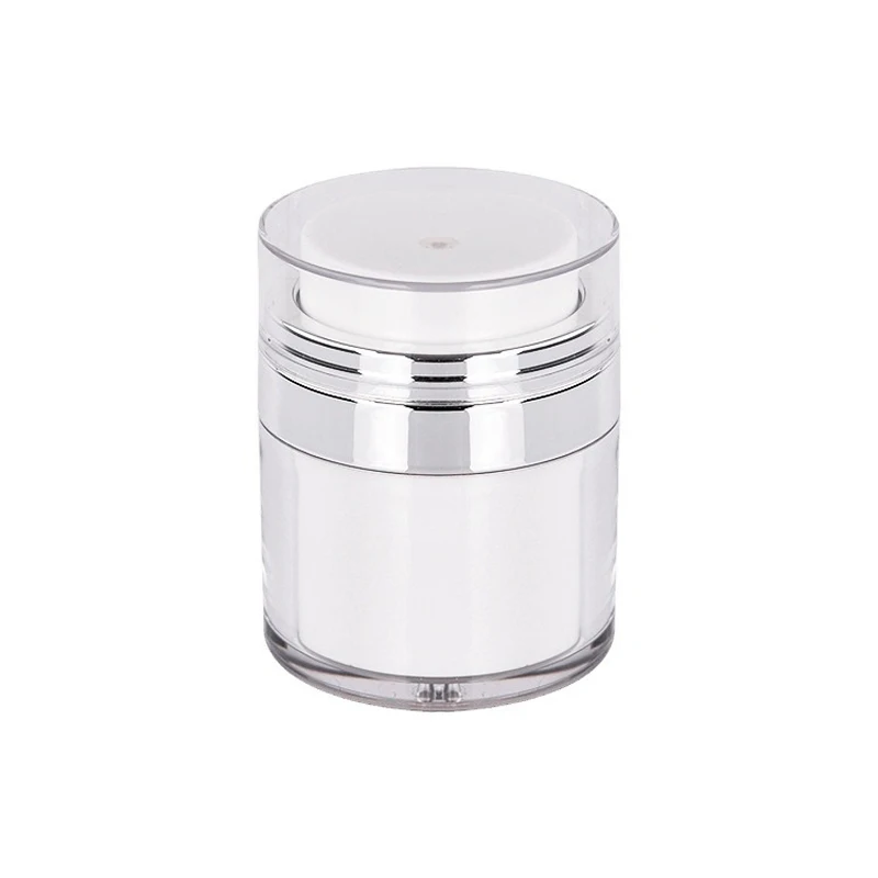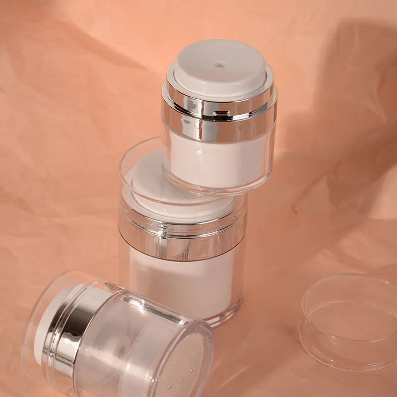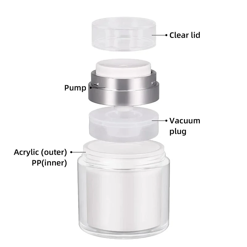 This refillable airless pump jar offers a clean, efficient, and hygienic way to store creams, lotions, serums, and other cosmetic products. Designed with vacuum technology, it dispenses every last drop without wasting your favorite skincare formulas. The durable acrylic body provides a sleek, premium look while protecting contents from contamination and air exposure. Available in multiple sizes—15ml, 30ml, 50ml, and 100ml—it’s perfect for both travel and everyday use. The portable design makes it easy to slip into makeup bags, purses, or luggage, ensuring your beauty essentials are always within reach. Its smooth pump mechanism delivers a controlled, mess-free application every time. Ideal for DIY skincare, professional use, or personal organization, this airless pump jar keeps your products fresh, clean, and protected longer.